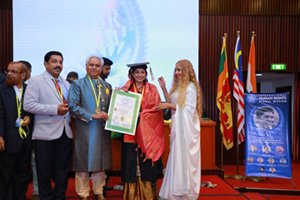 After 5 days Successful World Congress / Conference of Scientists of several Countries , in BMICH ,Colombo , Eminent Scientist His Eminence Prof. Dr. MADHU KRISHAN, The Chairman & Chief Rector of The American University University USA ( AUGP USA ) & United Nation University For Global Peace USA ( UNUGP ) conferred Doctorate Degree ( Honoris Causa) & Award of Human Excellence to Dr. Payal Neha Panigrahi in another Peace Summit & Human Rights Seminar in Colombo In Govt. Auditorium BMICH on 28 th November 2023.